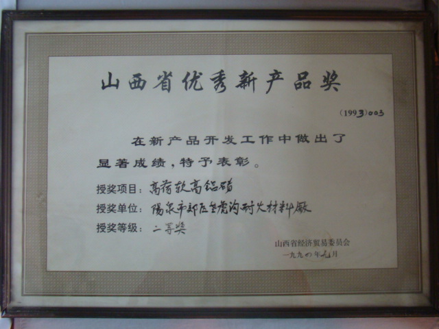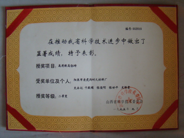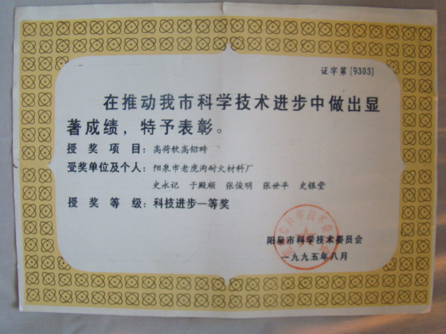 熱風(fēng)爐用低蠕變高鋁磚、高荷軟高鋁磚獲省科技進(jìn)步二等獎,微膨脹高鋁磚列入火炬計劃項目,炭素焙燒爐用特種高鋁磚已批準(zhǔn)國家專利